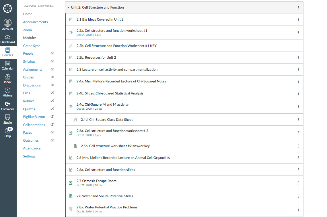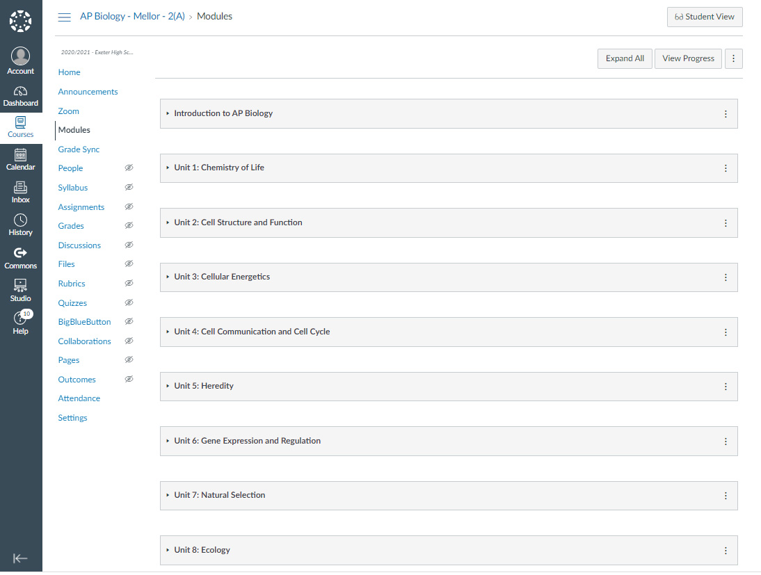 This is the organization of an Advanced Placement (AP) Biology course I taught through Canvas. AP Biology is a course for high school seniors. It has eight units designated by the College Board in preparation for the AP exam students take to earn college credit. Although there are some requirements for the laboratory activities and concepts that have to be covered for students to be successful on the AP exam, selection of content delivery and development of assessments are left to the discretion of the instructor. During virtual learning due to the pandemic, I built this in the Canvas Learning Management System. This was the first year of using Canvas as we had used Google Classroom prior to the switch to remote learning.