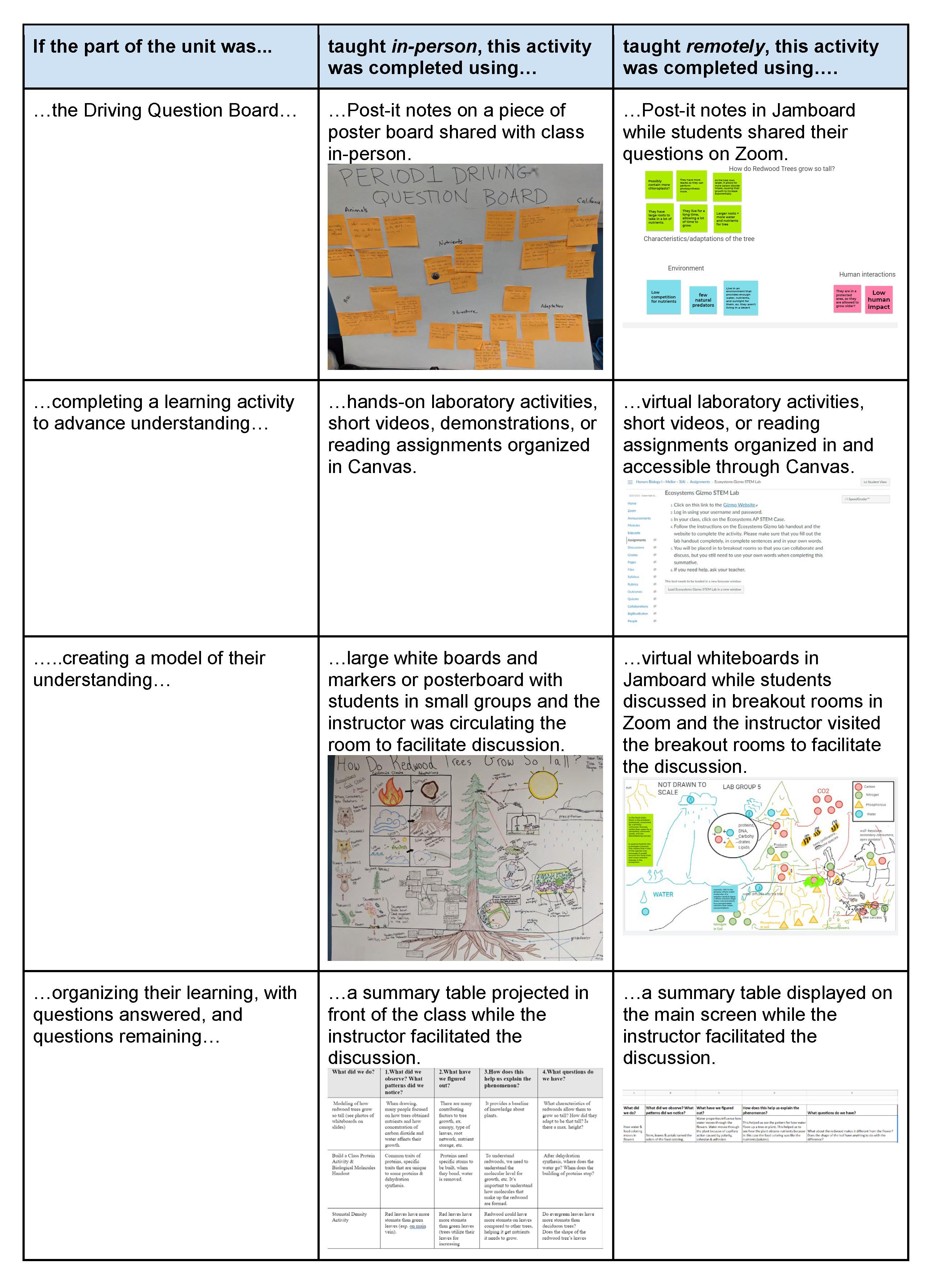 The unit is based on the Next Generation Science Exemplar (NGSX) method of teaching. NGSX is a phenomena-based learning strategy that incorporates claim-evidence-reasoning discussions and modeling. With this method of teaching, students are provided a “non-Google-able” phenomenon to investigate. As individuals and then as a group, they draw or create a model of their current understanding of the phenomenon, develop questions about what they do not understand (through a “driving question board”) and the instructor leads them through learning activities to expand the complexity of their knowledge about the phenomenon. Students share their models of understanding, the class frequently revisits the driving question board and the instructor facilitates discussion to develop their claim-evidence-reasoning skills.